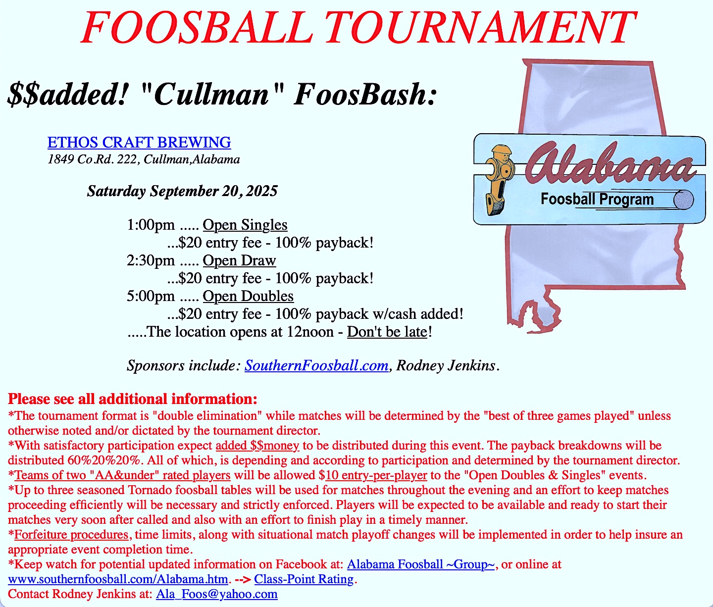 September 2nd 2025 $$added! "Cullman" FoosBash ... Saturday at Ethos Craft Brewing Cullman,AL.
