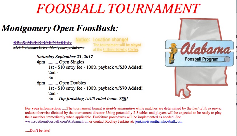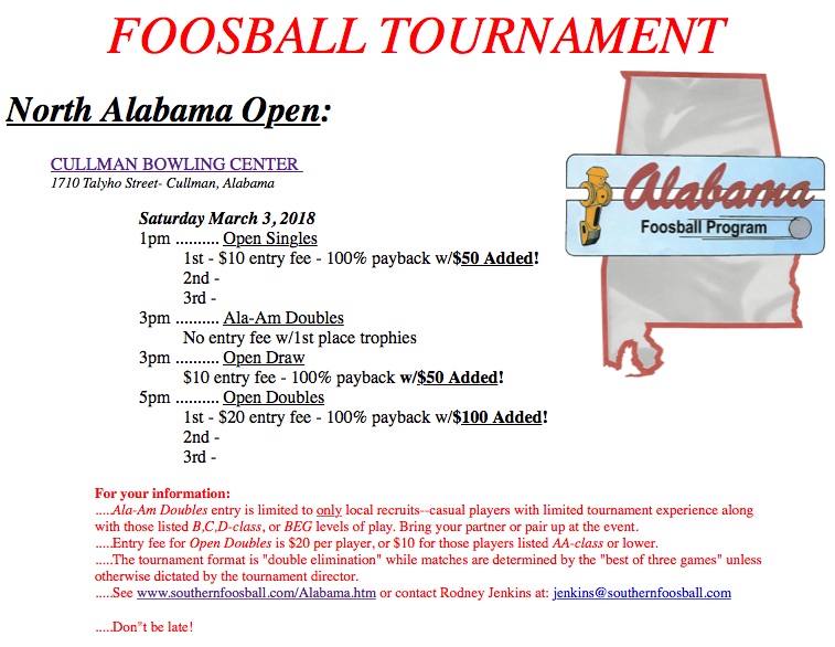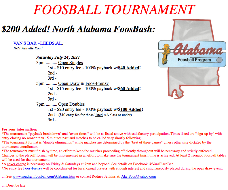 Mr. Recruiter, Foos-Frenzy!. Notes & Announcements. See info @www.southernfoosball.com/Alabama.htm.