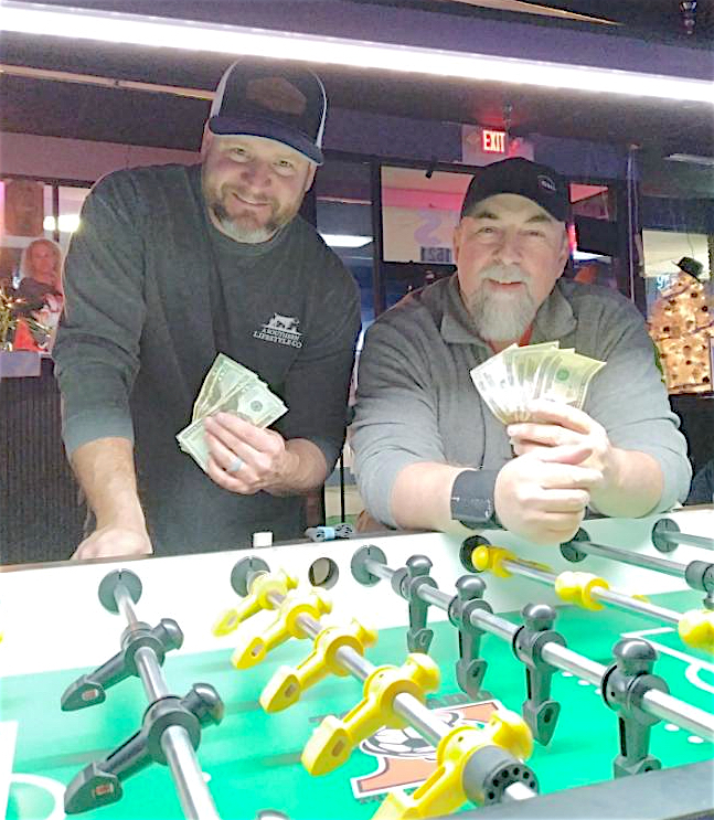 Shown to the right are the two teams of players that advanced to the championship game of the recent "2022 years-end event" that was held on Friday December 30th in Leeds, Alabama. Ten teams participated this weekly Foos-Friday Spot'DYP foosball tournament and withÊthe entry fees paid back combined with $300 cash added by the Gulledge brothers, a total of $500 prize money was created and up for grabs that these four players would eventually collect the majority$$. Players