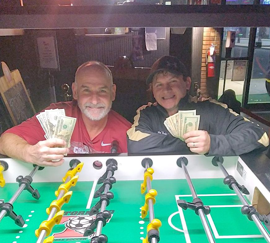 * Unless otherwise noted, the usual format involves $10 entry fee - 100% payback! The entry fee is collected per participant and 100% of it is then used for the prize breakdown distribution. Sometimes additional cash is added with exceptional player participation. The foosball tables are normally coin-operated and participating players are required to share equally in the cost of their games.