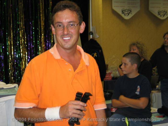 Terry Hedges, of Nashville, TN., is well known for his illusive magical talents and has now gathered much respect for his foosball talents as he was able to capture both rookie titles, rookie singles and rookie doubles. The rookie doubles title is a defending title for Terry as he also won the event is 2003, but this year teamed with local player Eddie Hutson. As mentioned above, the pair put forth a bold performance during semi pro doubles as well, finishing a very respectable 2nd place.