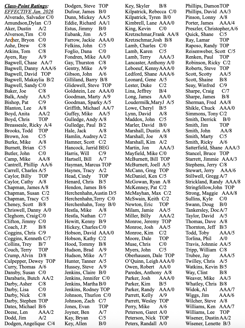 Alverado, Salvador C/0 Alverson, Tim C/0 Bagwell, Chase AA/7 Bagwell, Danny AAA/6 Bagwell, David TOP Blanton, Lee A/8 Boyd, Anita AA/2 Boyd, Chris TOP Camp, Mike AA/8 Cheney, Scott A/0 Cleghorn, Craig C/0 Crump, Alvin D/8 Darby, Asher C/8 Darby, Lisa C/0 Darby, Nick C/8 Darby, Stephen TOP Dodgen, Steve TOP Dunn, Mickey AA/5 Farrow, Jackie AAA/0 Griffith, Michael AA/7 Guffey, Mike AA/5 Gulledge, Andy A/8 Gulledge, Paul B/2 Hestla, Mike A/8 Hussey, Steve A/9 Jenkins, Claire B/0 Jenkins, Rodney TOP Key, Allen B/0 Key, Skyler B/8 Kilpatric, Tyren B/0 Kretzschmar, Frank AA/8 Lamb, Terry AAA/3 Lowe, Cheryl B/5 Marshall, Joe A/8 Martin, Jon AAA/3 McBurnett, Bill TOP McBurnett, Joell A/5 Monroe, Jeremy TOP Monroe, Kim C/2 Moore, Dale TOP Muse, Chris C/0 Parker, Randy AAA/0 Parrett, Kelly A/9 Parrett, Wesley TOP Porter, James AAA/4 Preszler, Christopher A/6 Raposo, Randy TOP Ray, Lamar TOP Renken, Paul TOP Roberts, Steve TOP Smith, Jim TOP Smith, John AA/8 Starrett, Jimmie AAA/3 Stewart, Jerry AAA/6 Strickland, Randy AAA/8 Thomas, Dave A/8 Widok, Al AAA/7 Wiggs, Jim AAA/6 Williams, Ken AAA/7 Williams, Lee TOP [PLAYER RATINGS-2026]