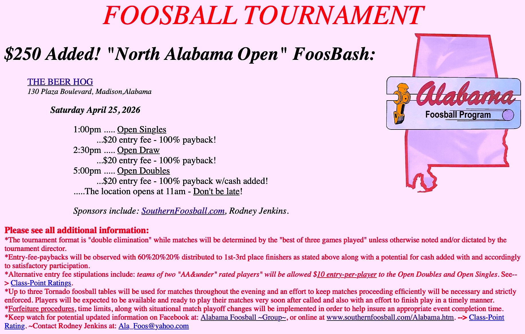 April 25th 2026 $250 Added! "North Alabama" FoosBash ... Saturday at The Beer Hog Madison,AL.